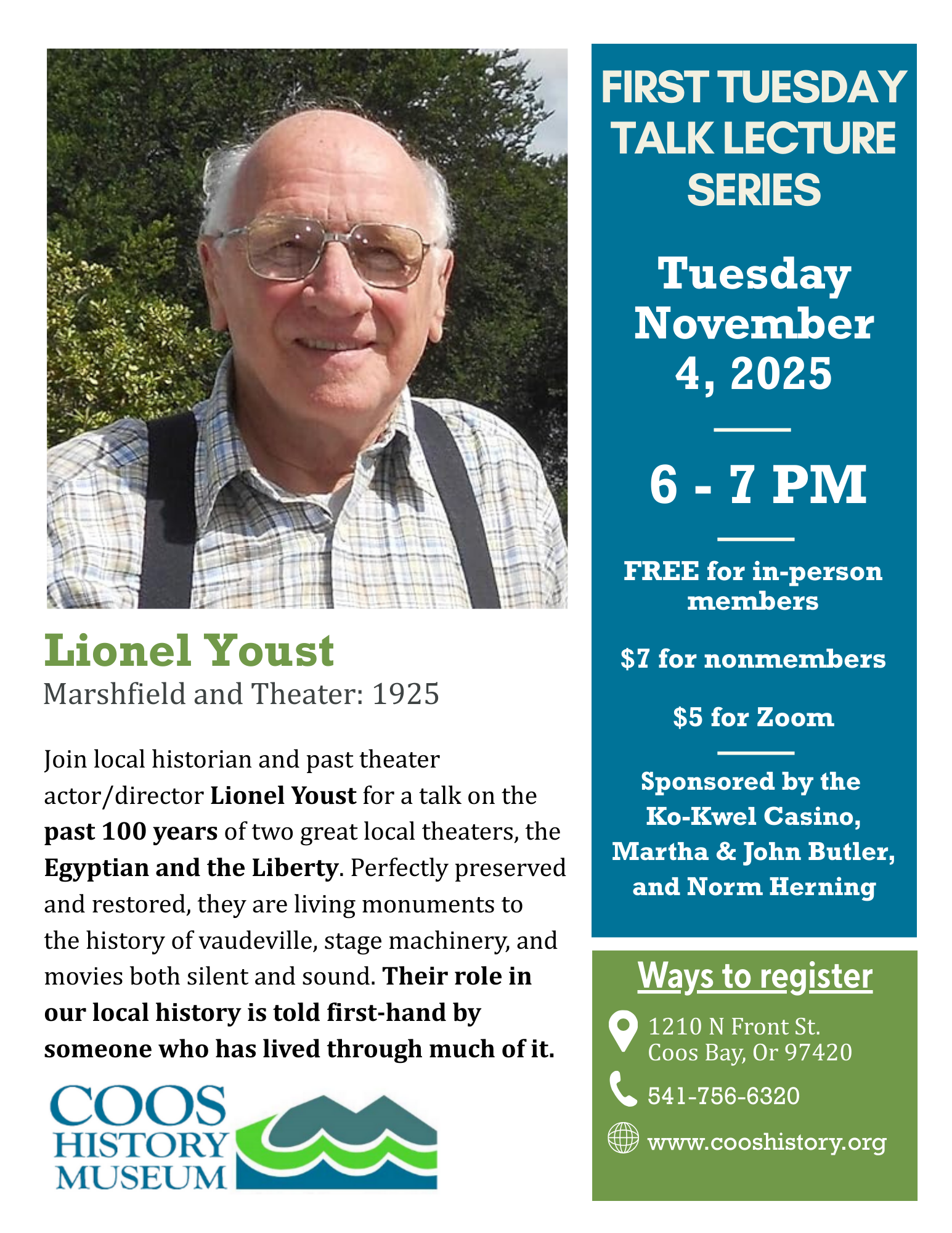 The First Tuesday Talks Lecture Series features speakers from various backgrounds, locations, and professions. Topics center around Oregon’s South Coast history, ranging from book signings to folk tales and more! This monthly program takes place every month except for January and July. Doors open at 5:30 pm and each lecture will begin at 6:00 pm.