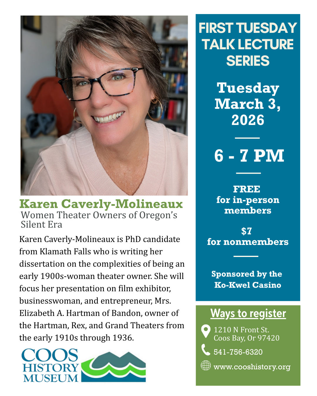 Women Historians. She presented her work at WAWH conferences in 2024 and 2025 and is honored to feature her dissertation work on Oregon women theater owners in the silent era at the Coos History Museum. She will give an overview of her work and focus the presentation of her findings on film exhibitor, businesswoman, and entrepreneur, Mrs. Elizabeth A. Hartman of Bandon. Hartman operated the Rex (formerly the Orpheum), Grand, and Hartman Theaters from the early 1910s through 1936, when the majority of downtown Bandon was destroyed by fire.